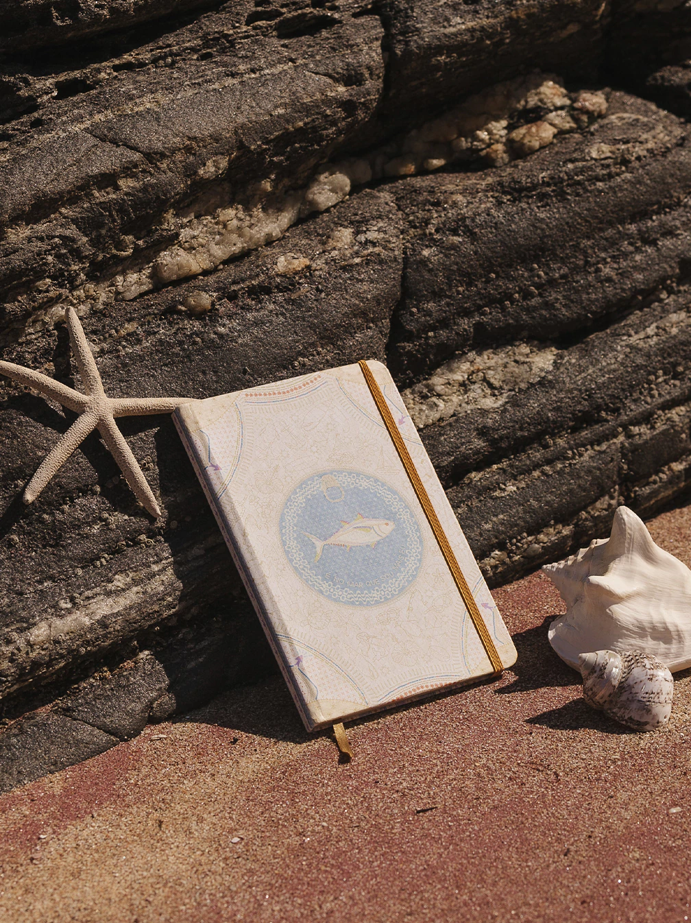a estampa Mar conta a história de memórias salgadas. Isabela traz muitos elementos que remetem à dias à beira mar, desde a sua infância até a vida adulta. lata de atum, nós náuticos, conchas e prancha de surf são só alguns dos elementos que compõem essa arte cheia de detalhes e histórias