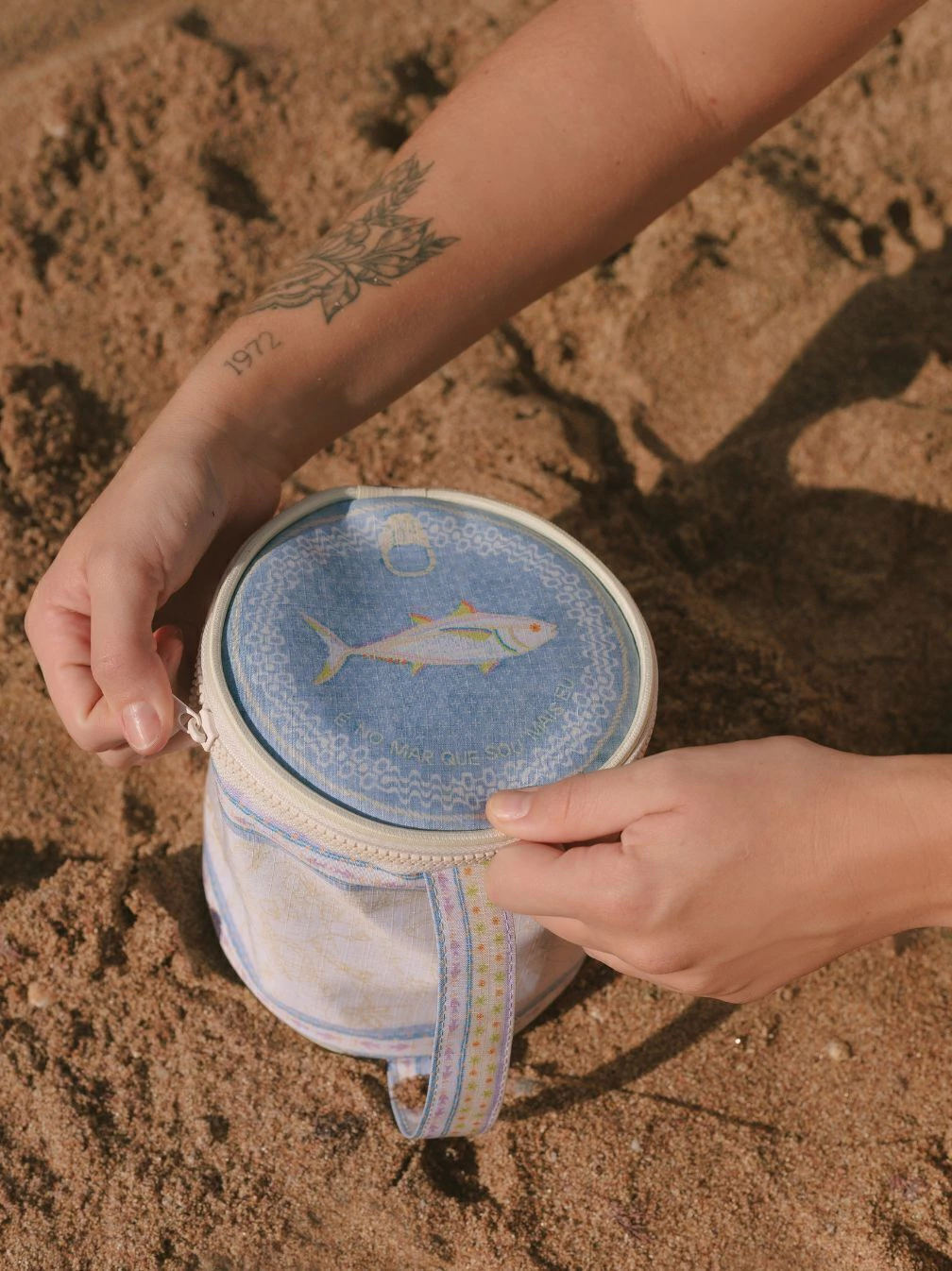 essa estampa tem como elemento principal a lata de atum, sempre presente nas vivências da Isabela em dias ao mar, acampando ou levando como sanduíche para passar o dia no mar.