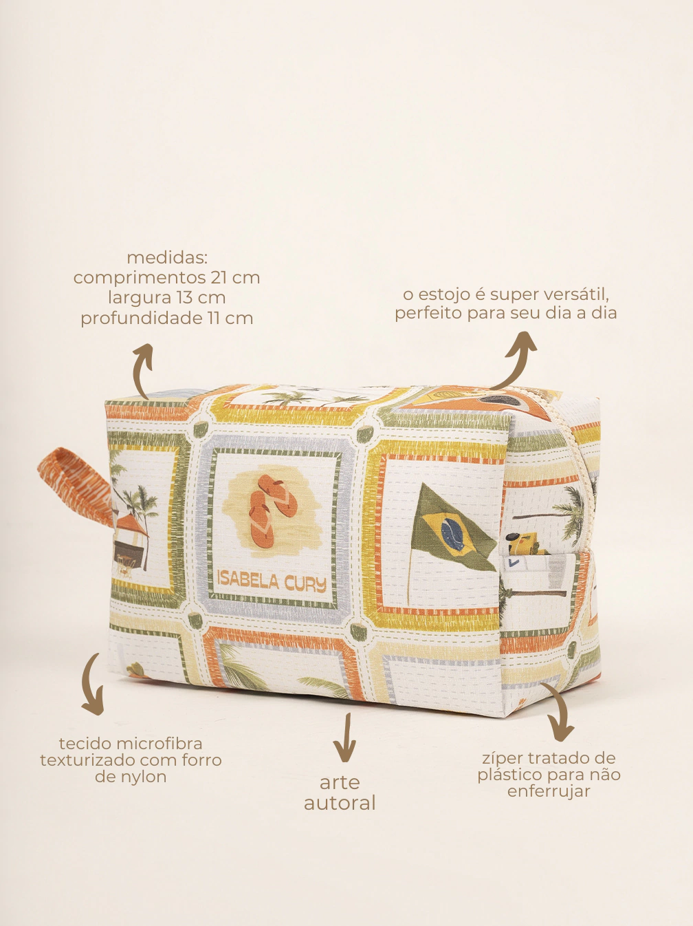 Com estampa exclusiva criada pela artista Isabela Cury, nosso estojo é perfeito para levar todos os essenciais com você! Ele tem o tamanho ideal para se encaixar na sua rotina e uma alça para carregar, leve seus itens para praia, trabalho, viagens, cursos... onde quiser. O estojo ipanema também é uma opção muito versátil para presentear.