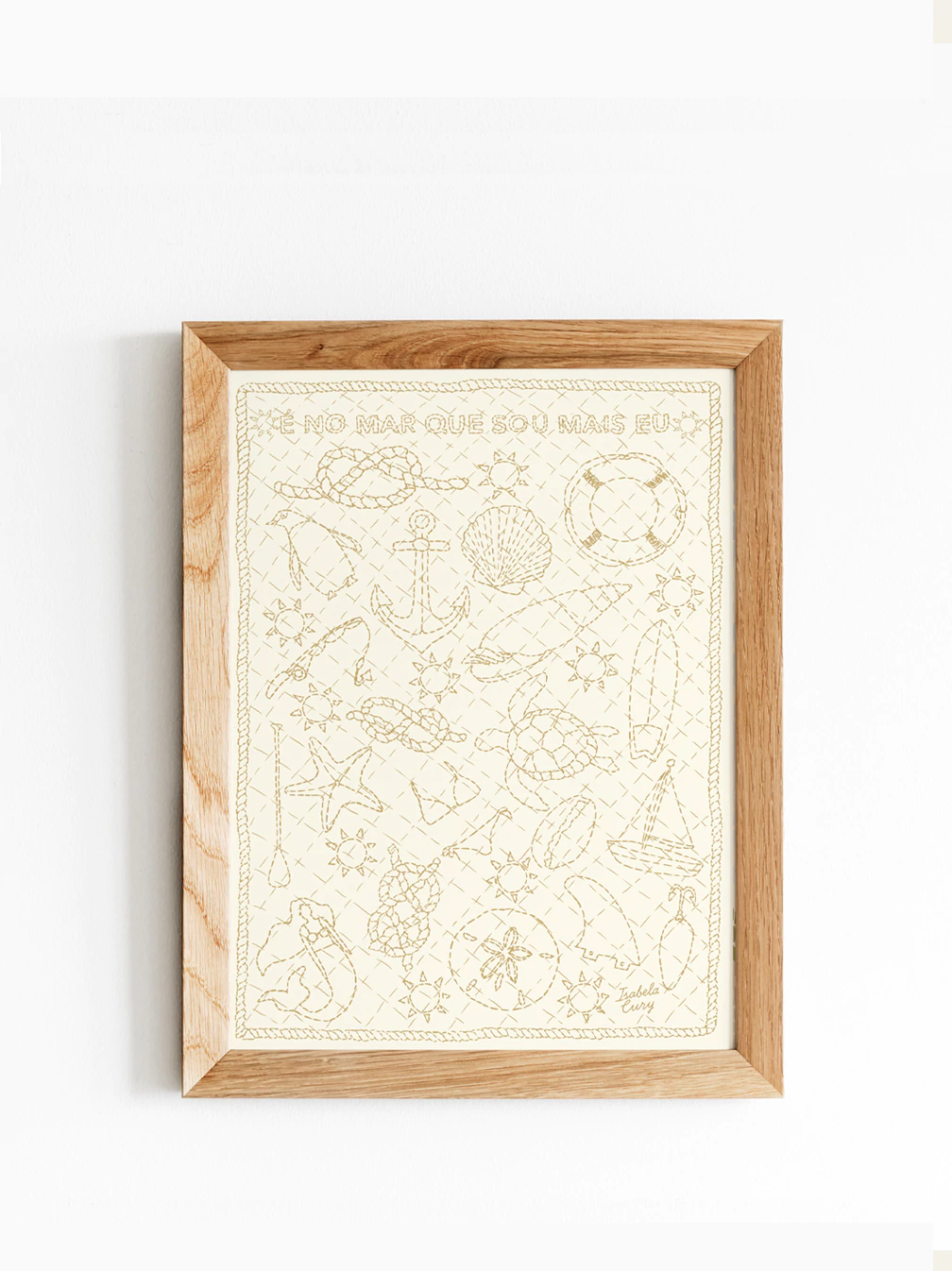 a arte Mar conta a história de memórias salgadas. Isabela traz muitos elementos que remetem à dias à beira mar, desde a sua infância até a vida adulta. tartaruga, nós náuticos, conchas e prancha de surf são só alguns dos elementos que se conctam como rede de pesca que abraçando todos eles e criando essa arte cheia de detalhes e histórias